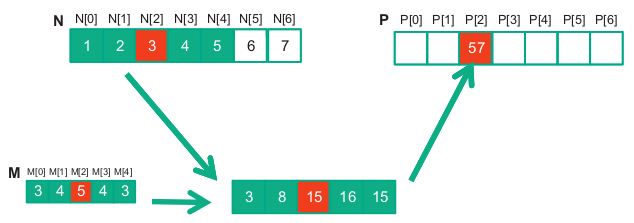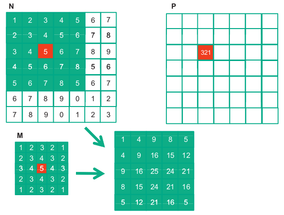 Below is shown a convolution example for 1D data where a 5-element convolution mask array M is applied to a 7-element input array N.